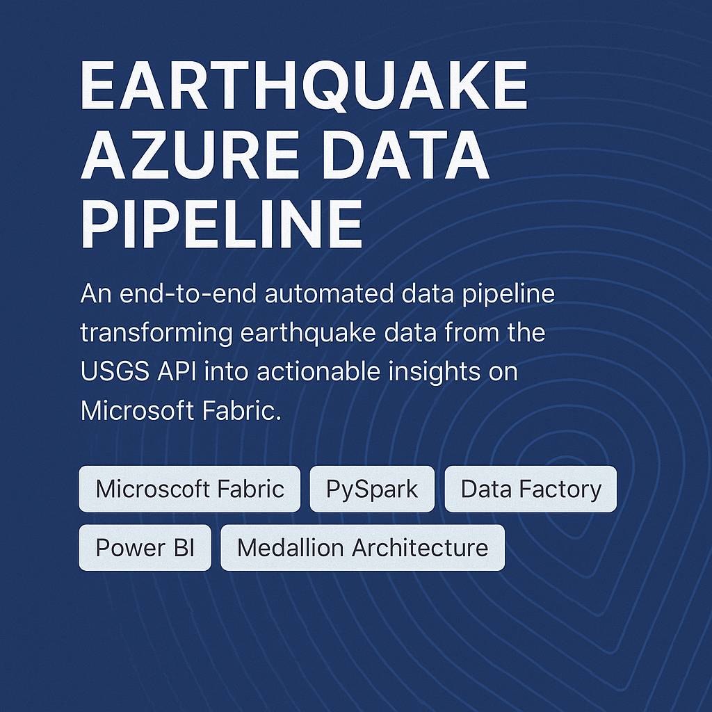 An end-to-end automated data pipeline in Microsoft Fabric transforming earthquake data from the USGS API into actionable insights using PySpark, Data Factory, and Power BI.